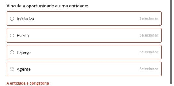 Esse campo permite associar a chamada pública a um Projeto, Evento, Espaço ou Agente.