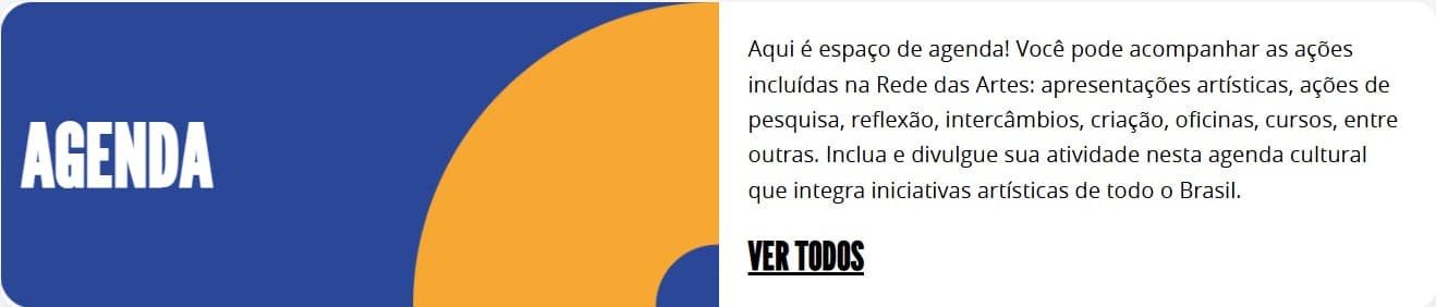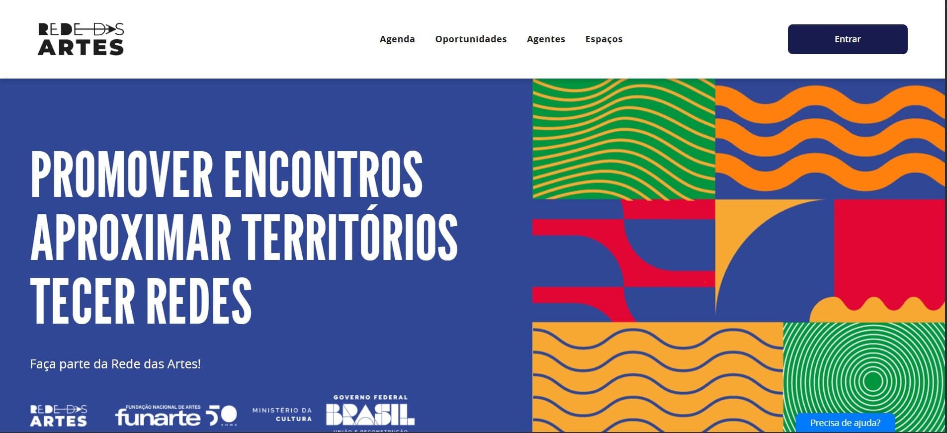 A Home da Rede das Artes é a porta de entrada para a plataforma, reunindo as principais informações e acessos rápidos para navegação. Nela, os usuários encontram um panorama atualizado da rede, com destaques de eventos, oportunidades, espaços e agentes artísticos cadastrados.
