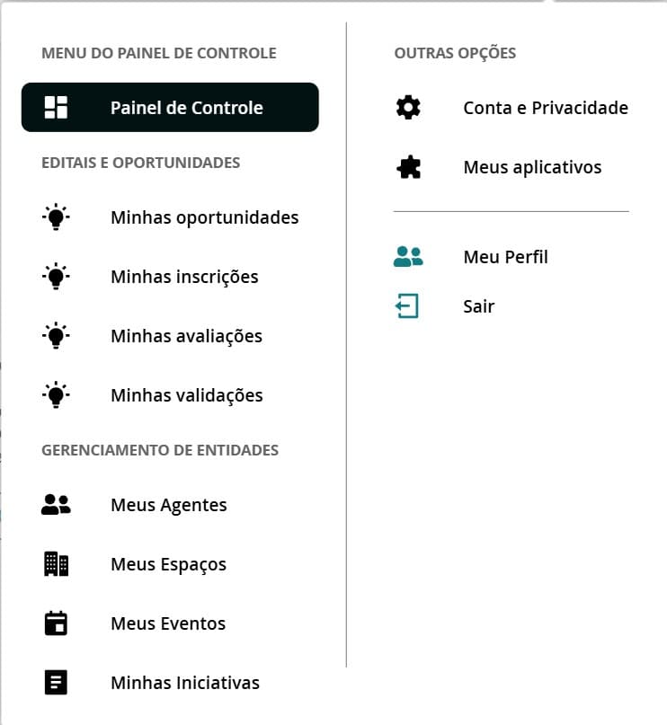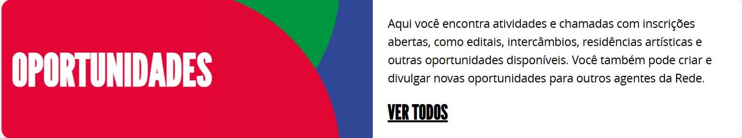 - Oportunidades: Seção dedicada à criação, divulgação e gestão de editais, chamadas públicas, premiações e incentivos culturais. Permite que agentes publiquem oportunidades e acompanhem inscrições, enquanto agentes culturais podem buscar, filtrar e se inscrever em processos seletivos diretamente na plataforma.