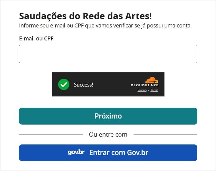 - Insira o seu e-mail ou CPF que a Rede das Artes faz uma busca para verificar se você já possui uma conta: