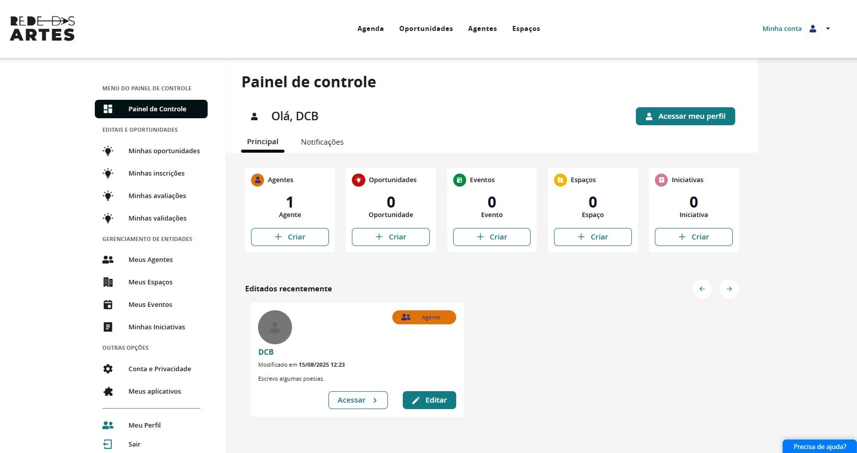 - Agentes: Espaço onde artistas, coletivos e profissionais da cultura podem cadastrar suas informações, incluindo áreas de atuação, histórico, contatos e vínculos com projetos, espaços e eventos, facilitando conexões e colaborações.